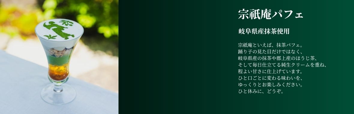 岐阜県郡上市・郡上八幡で抹茶スイーツを楽しむなら宗祇庵。 岐阜県産抹茶を使用したパフェや和スイーツ、夏季限定のかき氷をご用意しています。 看板メニューの宗祇庵パフェは、純生クリームと抹茶の風味を重ねた一品。 ひるがの高原いちごを使用した苺大福かき氷など、季節ごとの甘味もお楽しみいただけます。 また、抹茶だけでなくコーヒーや和スイーツ、チーズケーキなどの甘味も季節ごとにご用意しており、 郡上八幡観光の合間に立ち寄れるカフェとしてご利用いただけます。