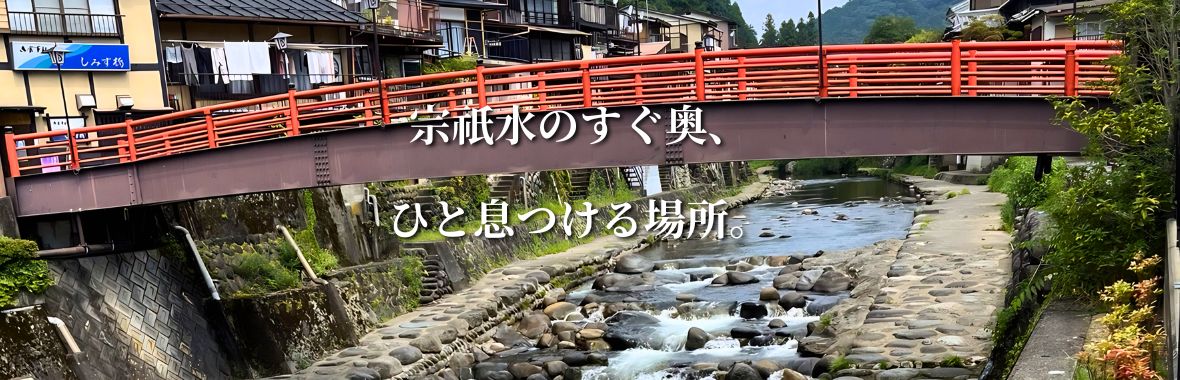 宗祇庵は、郡上八幡の名水「宗祇水」のすぐ奥にある和カフェです。 店舗横には小駄良川が流れ、川の音を感じながら過ごせる立地。 赤い橋を目印に、観光の流れで立ち寄りやすい場所にあります。 郡上八幡観光の合間の休憩や、涼をとるスポットとしてご利用いただけます。